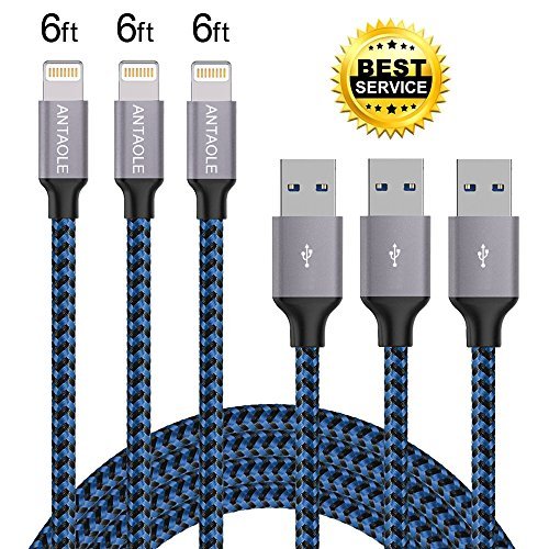 "Title: iPhone Charger, ANTAOLE 3PACK 6Feet Nylon Braided Charging Cable Cord Lightning to USB Cable Charger for iPhone X/8/7/6/6s/plus/5c/5s/SE, iPod, iPad, IOS11 and More (Blue)