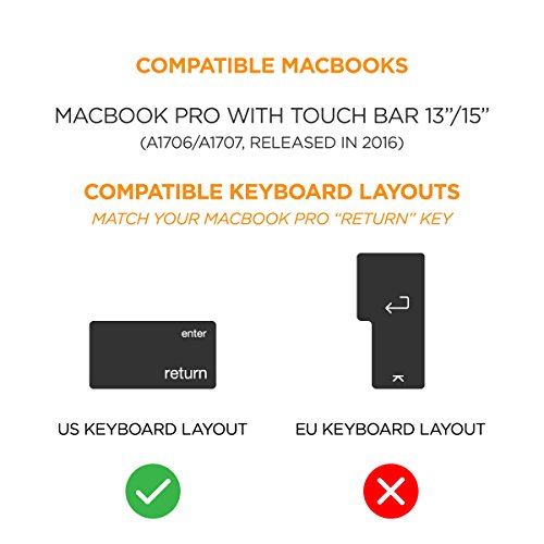 - Engineered to fit precisely to the keyboard of your 2016 Macbook Pro with Touch Bar (Apple Model Number A1706, A1707) US Keyboard Layout Only