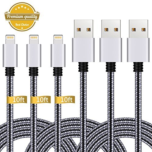 "Title: iPhone Charger,3Pack 10FT Lightning to USB Cable Nylon Braided Charging Cord Compatible with iPhone X 8 Plus 8 7 Plus 7 6 6S 6 Plus 5S SE iPod iPad Mini Air Pro (Black Gray)