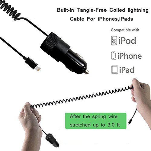 "Title: iPhone Car Charger, 4.8A Rapid USB Car Charger + Coiled Lightning Cable Compatible iPhone X/8/8 Plus/7/6s/6s Plus 5S 5 5C SE, iPad More