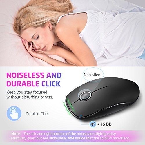 - COMFORTABLE FIT AND NOISELESS CLICK. Streamline design wireless mouse offers your hand maximum support for lasting comfort. Quiet clicks free your worry about bothering others and keep you stay focused while working. Anti-fingerprint and sweat-resistant finish makes it skin-friendly for constant use.